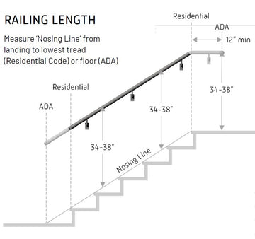 Pour une installation optimale conforme aux normes ADA ou pour toute application commerciale, mesurez depuis un point sur le sol à une profondeur de marche devant la marche inférieure. Au palier supérieur, assurez-vous que la rampe de main s'étend horizontalement d'au moins un pied.